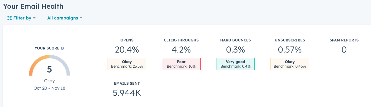 This gives you a score from 1-10 based on your open rates, click-throughs, hard bounces, and unsubscribes compared to companies in your industry.