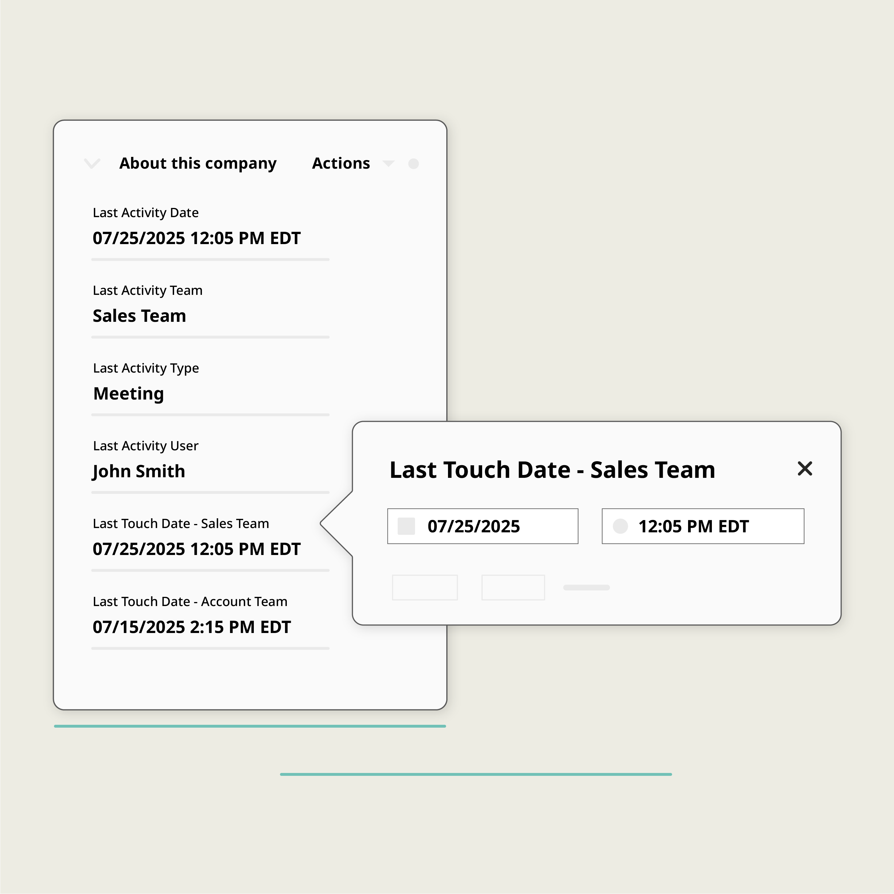 - Per-team dates: Last Touch - Sales, Last Touch - CS (update when Last Activity Team changes). This gives you expansion context and CS coverage at a glance.
