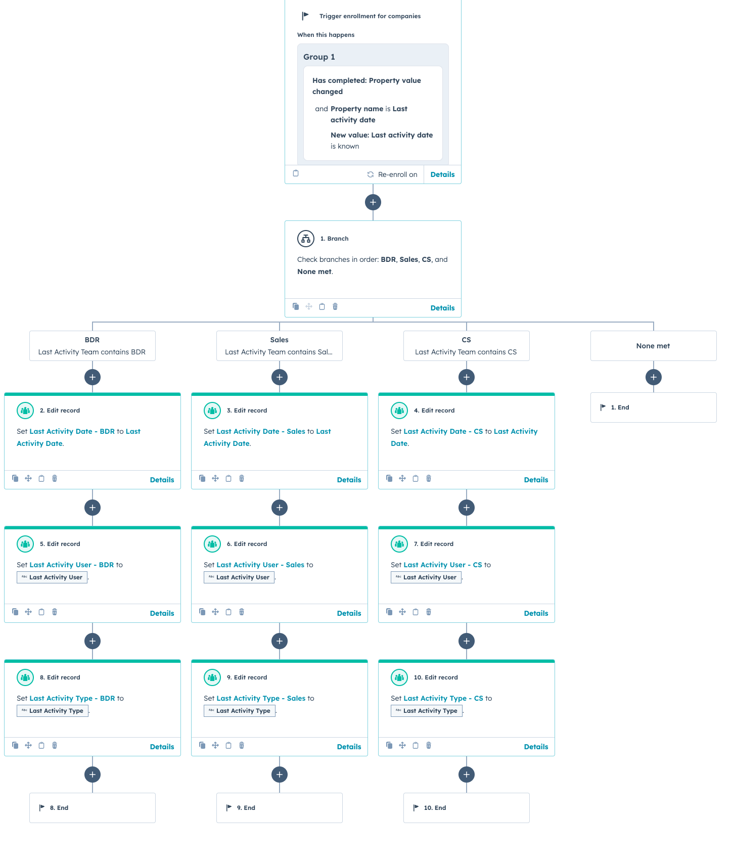 Trigger: Any call, email, or (held) meeting on Contact/Company/Deal.
